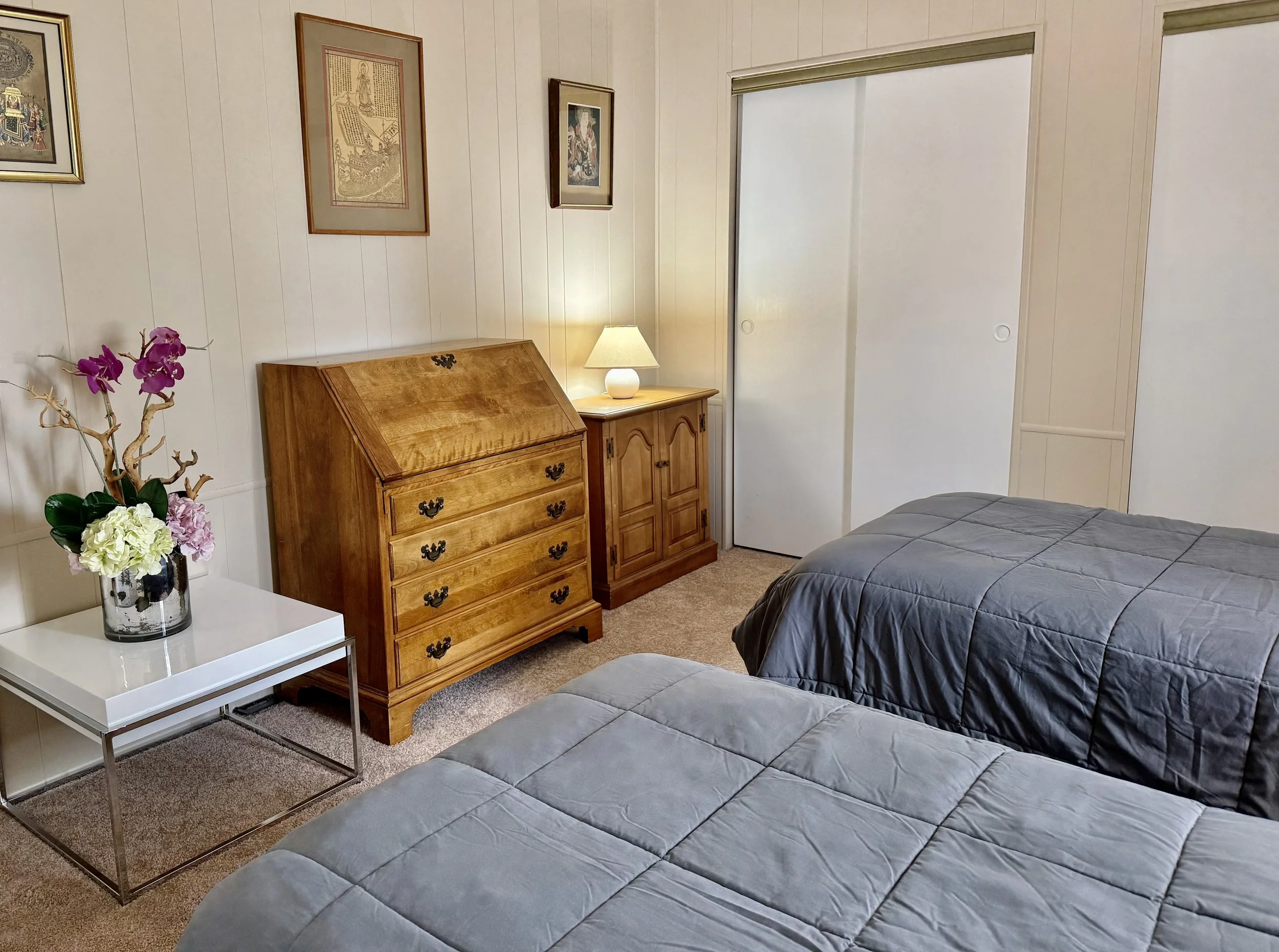 Sleeps 4 people with a queen size bed & 2 single beds. It has a full bathroom, kitchen with microwave, heat & air conditioning.